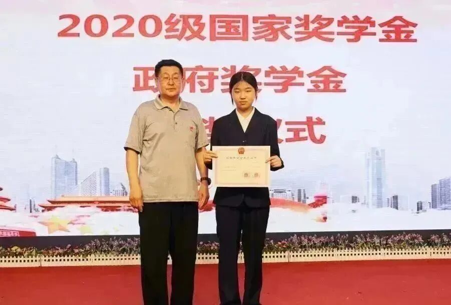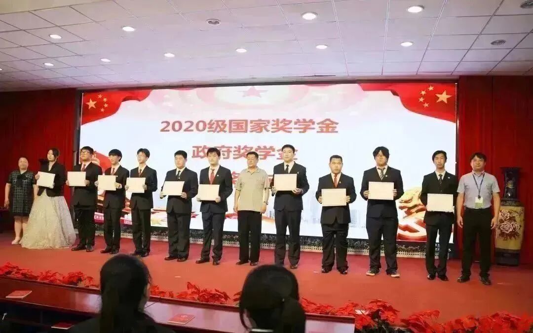 校领导为获得国家奖学金和政府奖学金的学生颁奖。