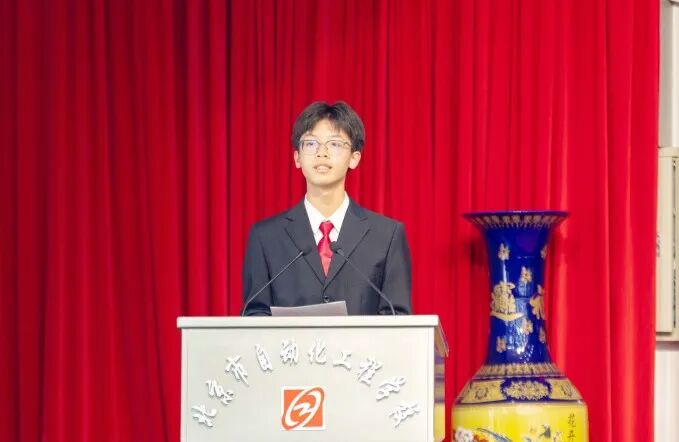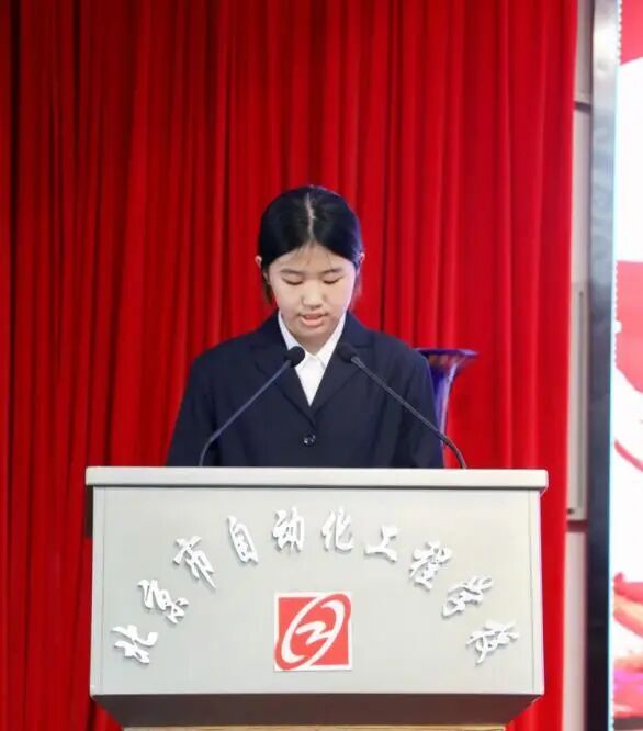 信息20班曹鑫垚代表宣誓学生发言:作为新时代青年要不忘初心、砥砺前行,不辜负习近平总书记对中国青年的嘱托,勇敢地接过党和国家建设发展的接力棒,努力成长为德智体美劳全面发展的合格建设者和可靠接班人。