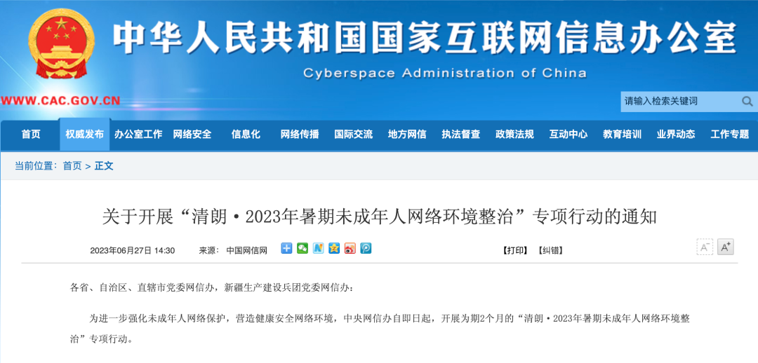 近日,中央网信办发布了为期2个月的“清朗·2023年暑假未成年人网络环境整治”专项行动。