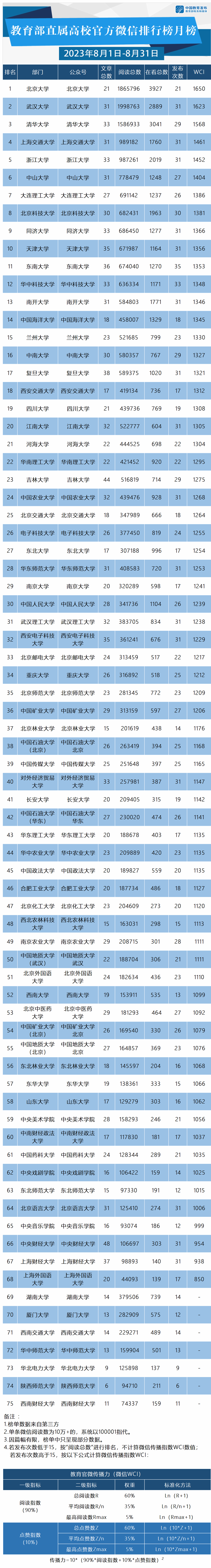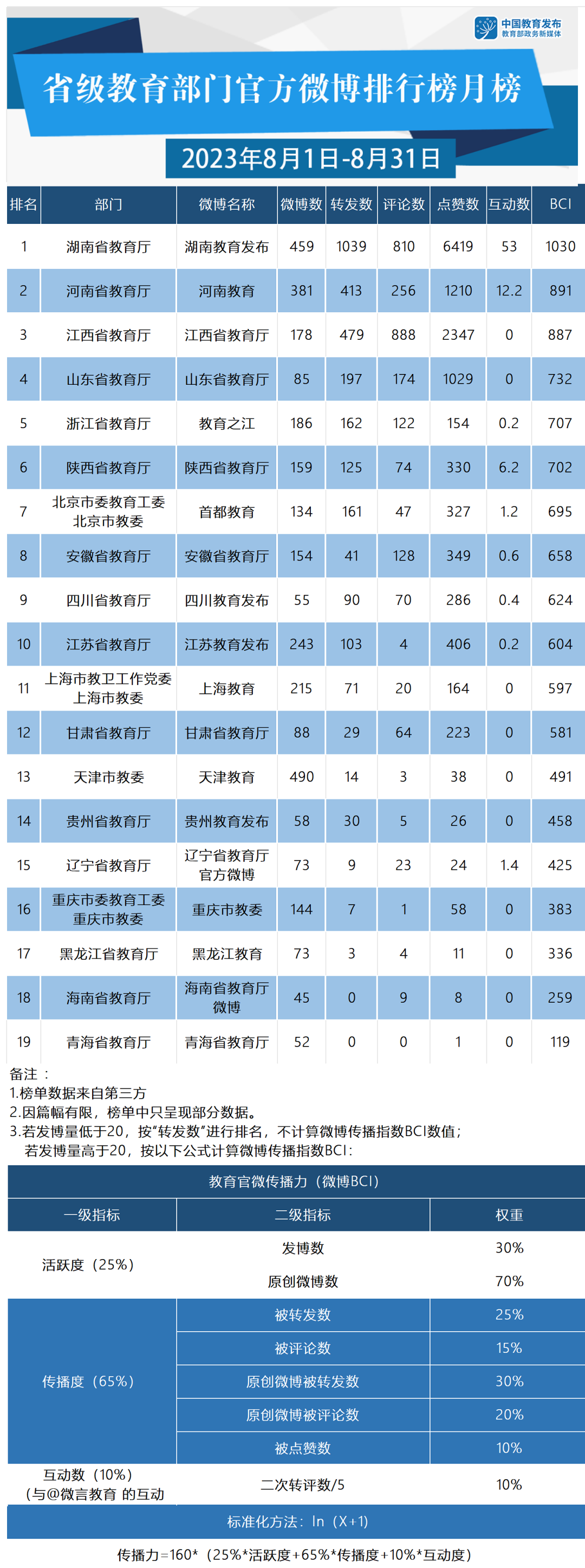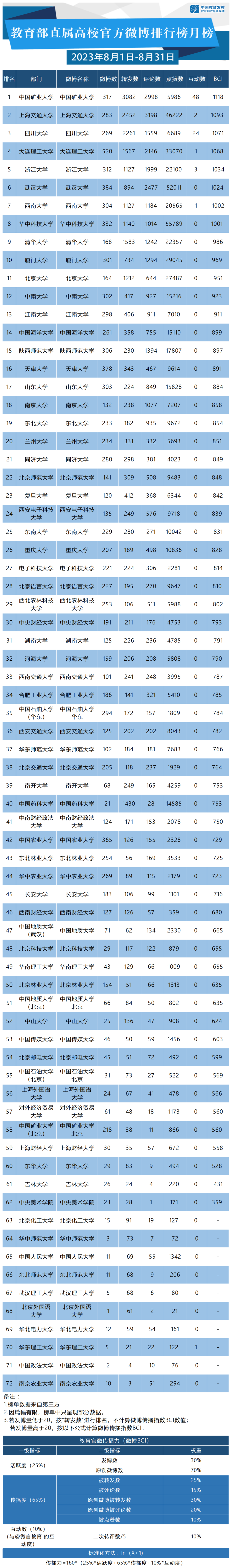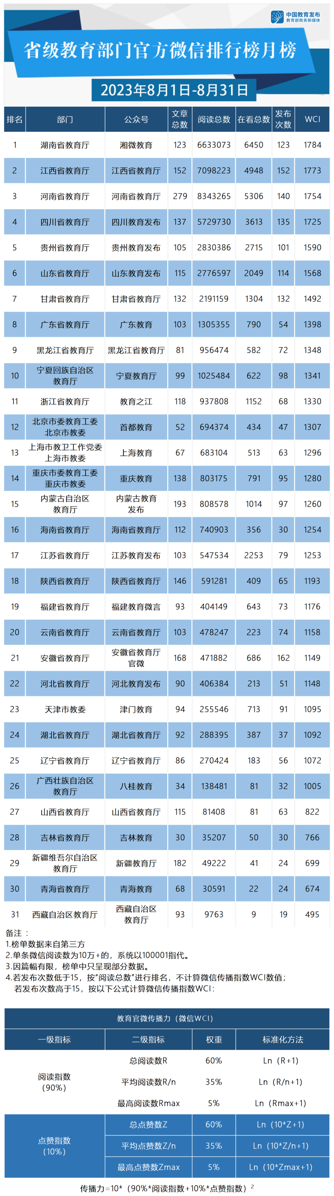 第三方机构对省级教育部门和教育部直属高校的官方微信公众号、微博2023年度8月份传播效果进行数据分析,并附点评。跟教育小微一起来看——