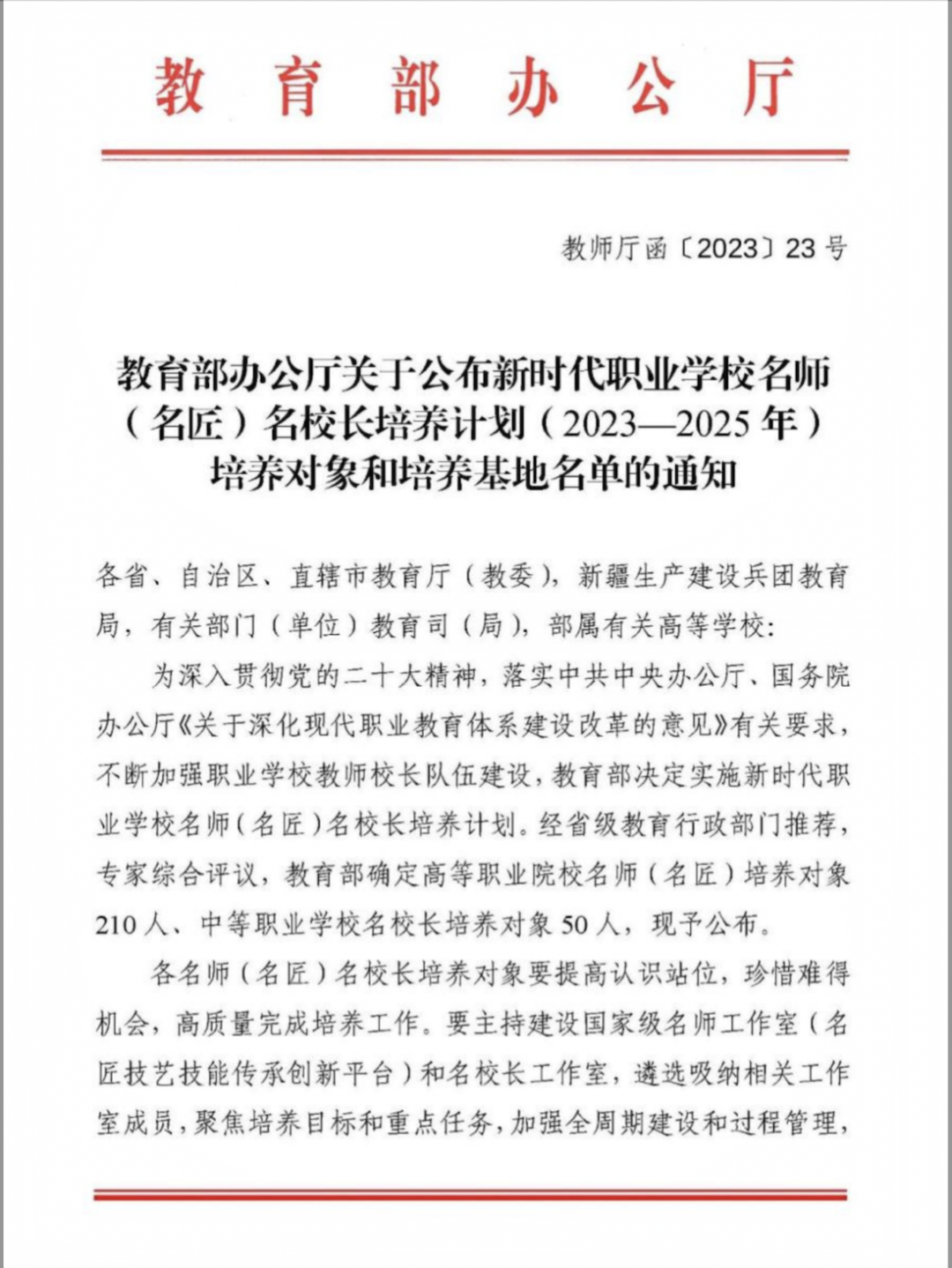 为深入贯彻党的二十大精神,落实中共中央办公厅、国务院办公厅《关于深化现代职业教育体系建设改革的意见》有关要求,教育部决定实施新时代职业学校名师(名匠)名校长培养计划(简称职教“三名”计划)。