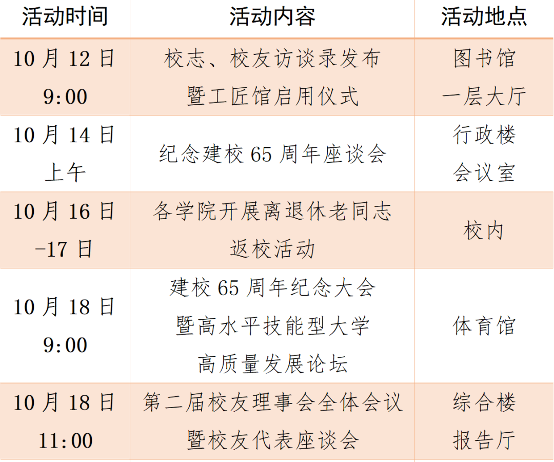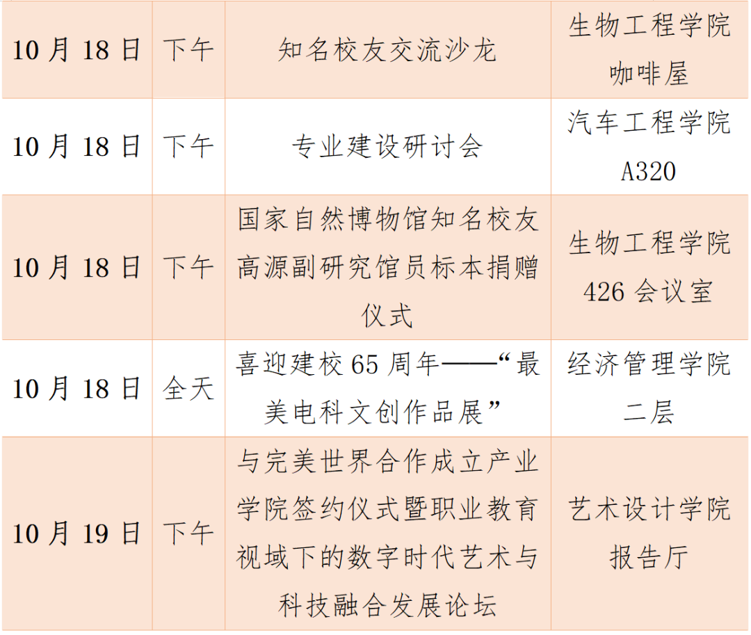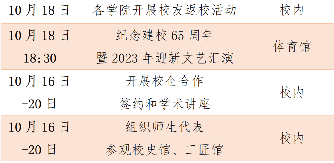 校友系列活动由各二级学院安排对接,主要集中在10月18日下午,具体活动内容、时间等请咨询各二级学院联系人。