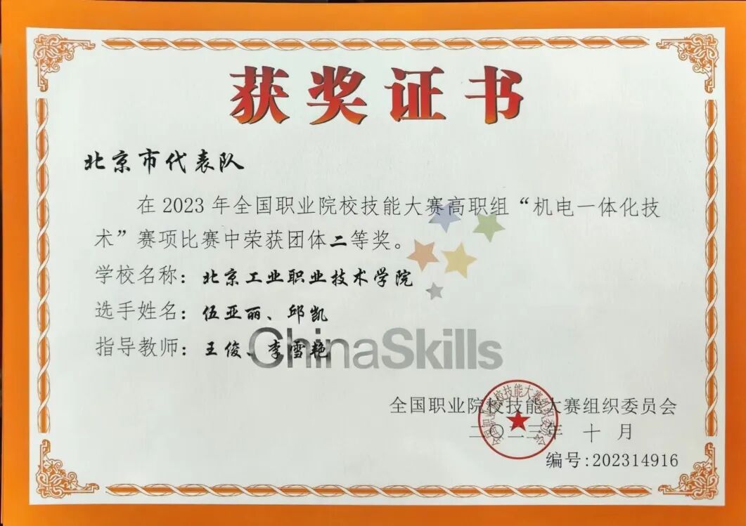 我校机电学院参赛队作为北京市 “机电一体化技术”赛项代表队参与此项赛事。经过两天的激烈角逐,机电工程学院机电一体化专业学生邱凯、伍亚丽最终取得第10名的成绩,斩获全国二等奖。