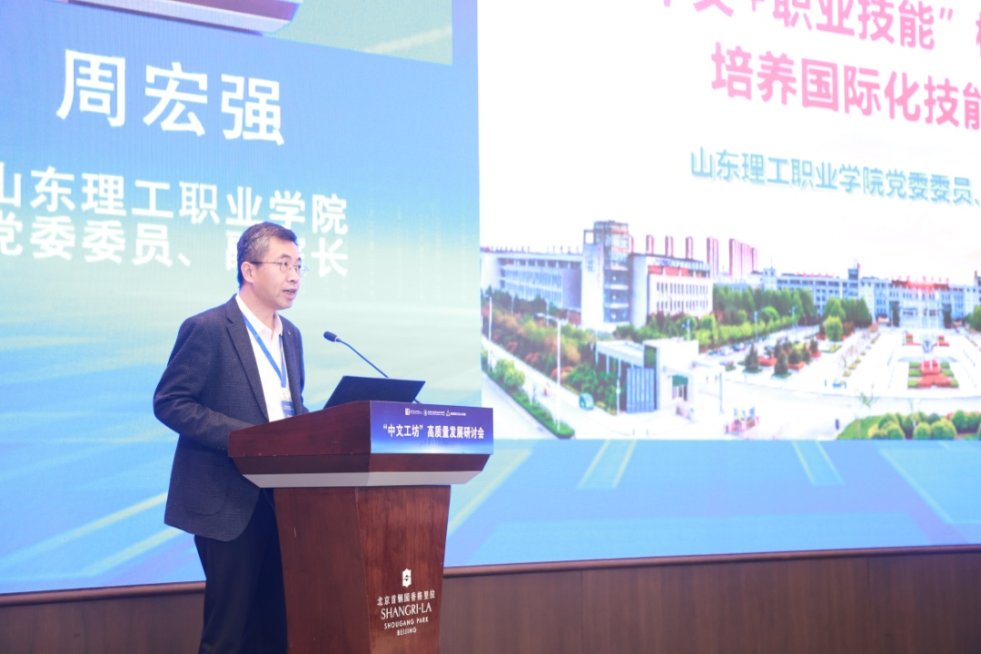 山东理工职业学院党委委员、副院长周宏强作题为《“中文+职业技能”模式领航出海 培养国际化技能型人才》的主旨报告